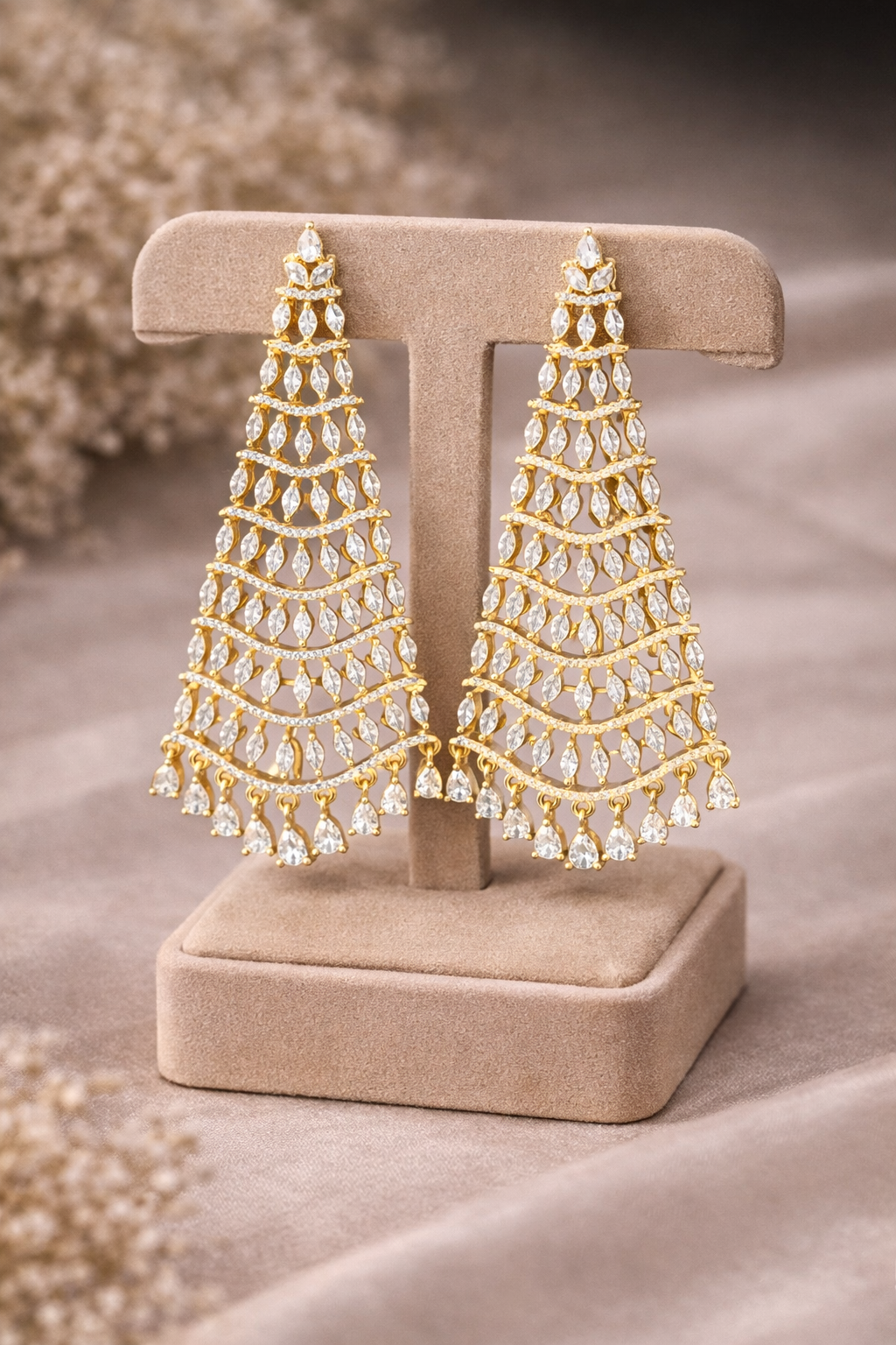 These statement earrings feature a cascading chandelier silhouette that catches the light with every turn. Perfect for grand weddings or black-tie events, they pair beautifully with an elegant updo to showcase their royal sparkle.