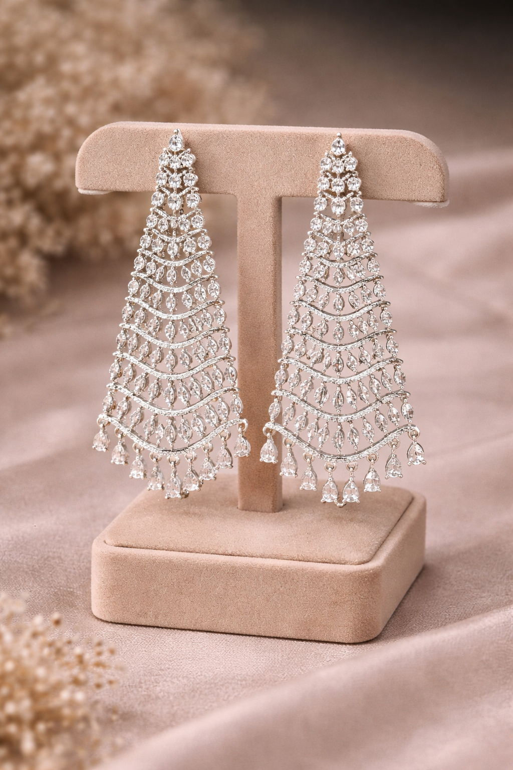 These statement earrings feature a cascading chandelier silhouette that catches the light with every turn. Perfect for grand weddings or black-tie events, they pair beautifully with an elegant updo to showcase their royal sparkle.