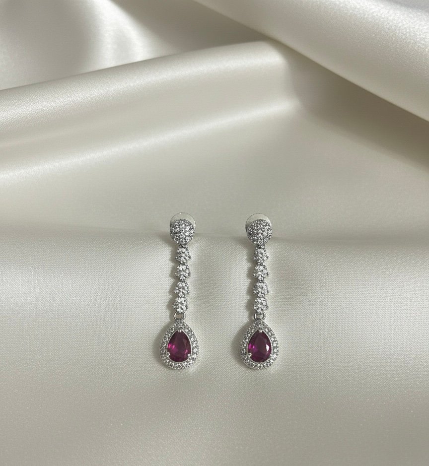 Beautiful silver-toned earrings featuring a dainty floral chain and a stunning ruby-red teardrop stone.