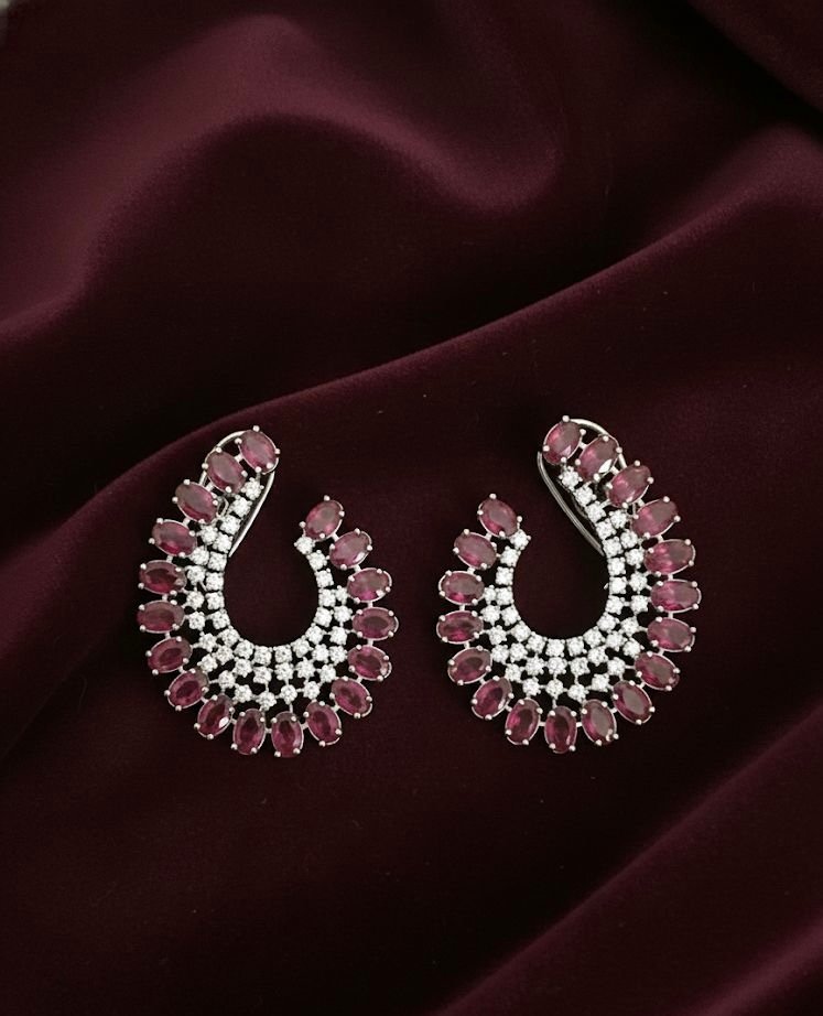 Bold crescent earrings highlighted with deep ruby-toned stones and shimmering crystal accents.