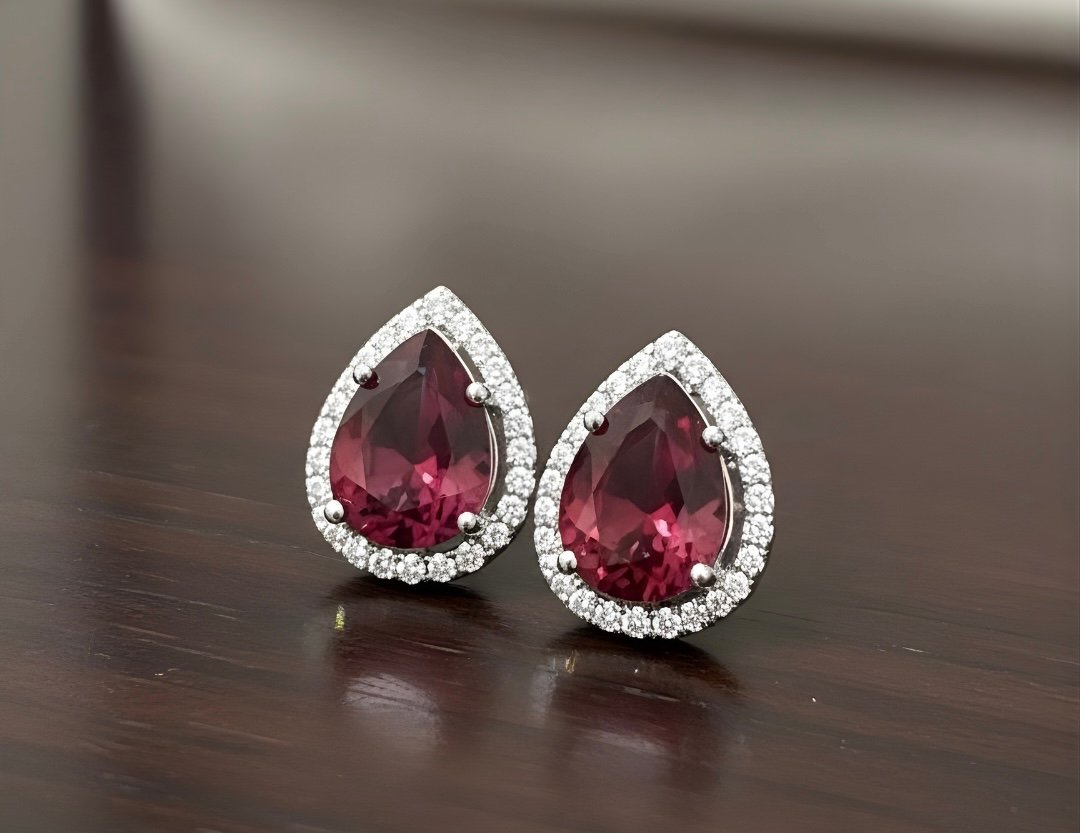 Classic stud earrings centred with rich ruby-toned stones and a delicate crystal halo.