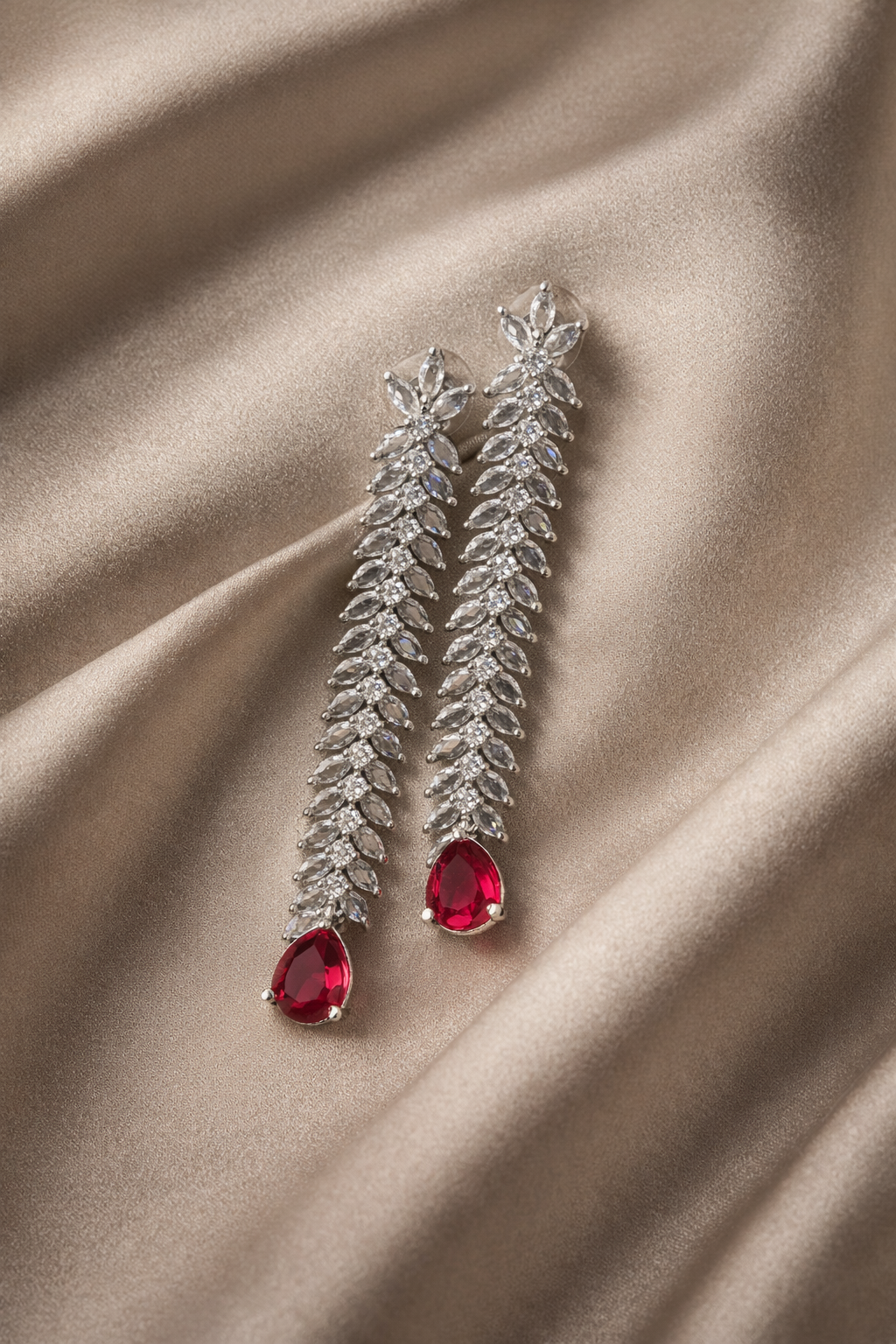 Elegant vine-inspired drop earrings crafted with marquise crystals and ruby-toned teardrop accents.