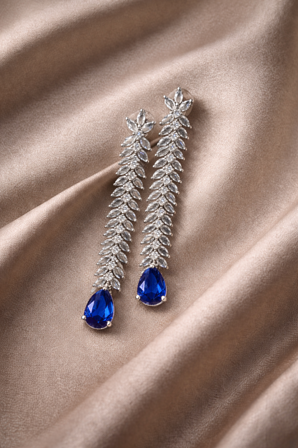 finished with a striking sapphire-hued teardrop for a timeless, refined look.